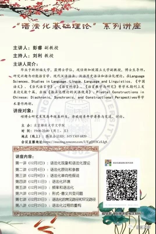 彭睿,毕业于斯坦福大学,博士学位,现任新加坡国立大学中文系副教授、博士生导师。研究兴趣包括汉语语法、汉语历史语言学、语法化理论和功能语言学,在Language Sciences、Studies in Language、Journal of Chinese Linguistics、Language and Linguistics、《中国语文》《当代语言学》《语言科学》《语言教学与研究》等学术期刊上发表论文数十篇