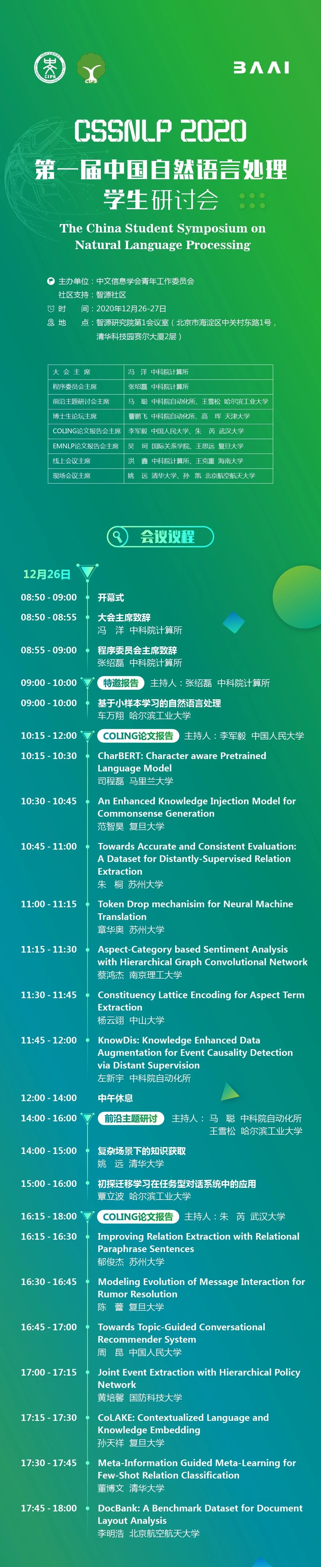 本次会议为第一届中国自然语言处理学生研讨会,包含特邀报告、前沿主题讲习班、博士生论坛、COLING 论文和 EMNLP 论文报告五个环节,主要目的是为自然语言处理研究领域内的中国青年学者提供一个学术交流平台。同时鼓励更多的青年学者关注自然语言处理前沿研究,展示最新科研成果,促进国内青年学者的思想交流和学术合作,进而推动自然语言处理在中国的发展。