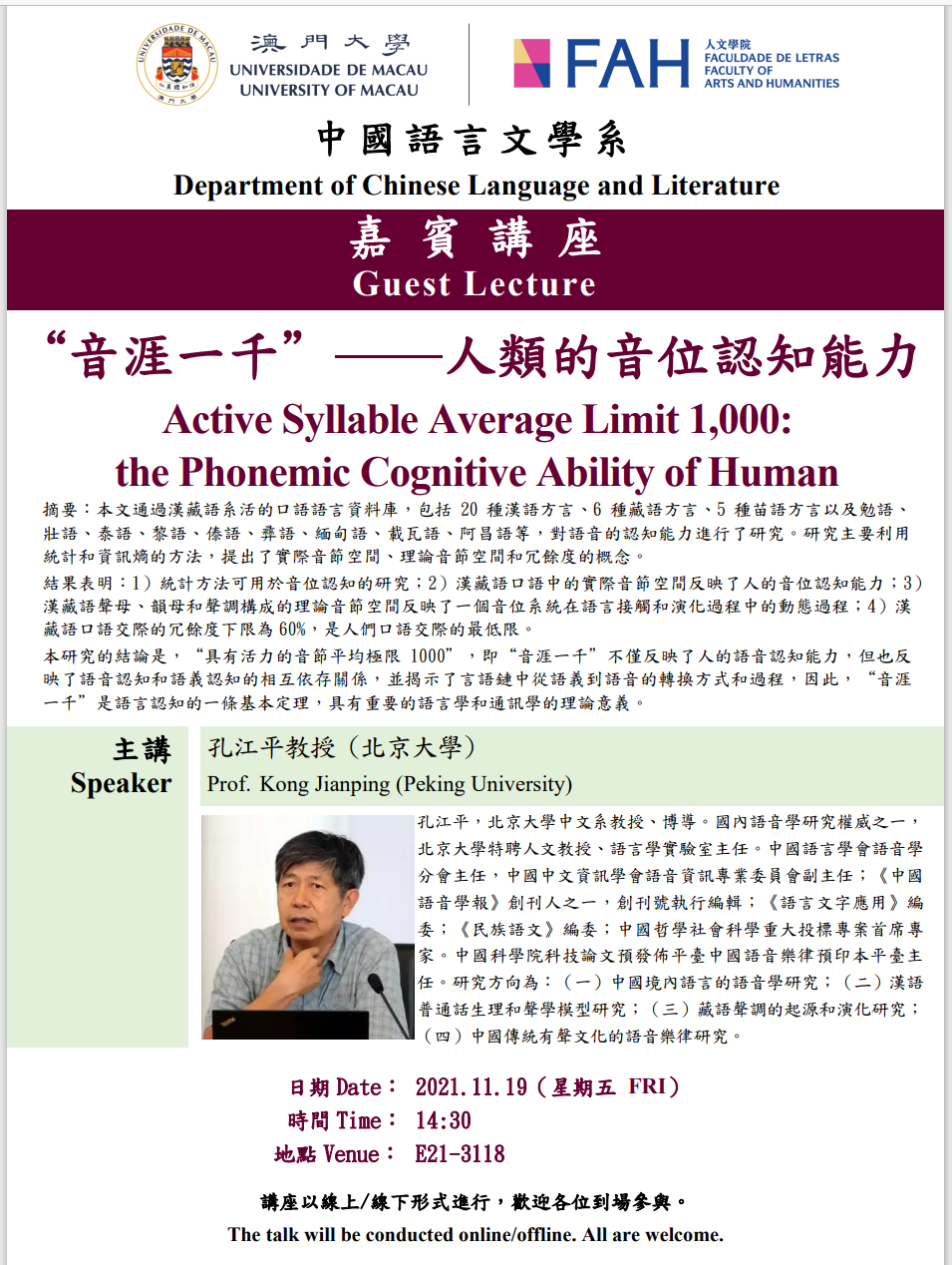 北京时间2021年11月19日(本周五)下午2:30,澳门大学中文系邀请北京大学中文系语音乐律实验室孔江平教授作主题演讲,题目: