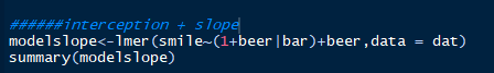 我们选择后一种方式来进行模型建构。首先,使用lmerTest包中的lmer功能进行模型估计,然后使用summary输出结果。如图5,在这个功能的formula当中,1 表示随机估计每个barbeersmile影响截距,“beer|bar”表示随机估计不同bar中,中beersmile影响的斜率。