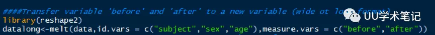 ps: 使用reshape2中的melt命令,id.var 意思是不需要转化的变量,measure.vars 表示需要转为长型数据的变量,注意添加向量符号c