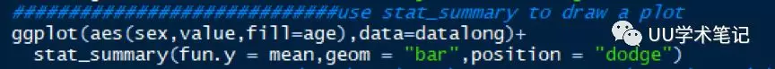 但是这种形式的作图有一个大前提,即要用来画图的数据框已经是经过分组汇总之后的数据 (比如常见的按照自变量分组求因变量的均值,标准差等等)。因为geom_xxx等命令并没有统计功能。如果要使用未分组汇总的数据画图,则需要使用stat_summary功能。