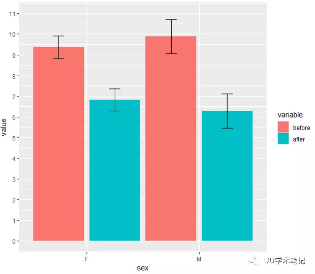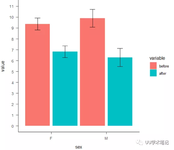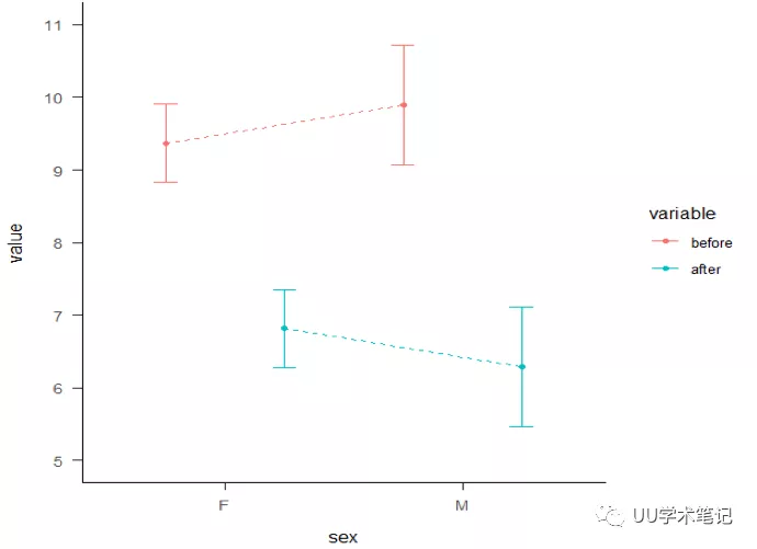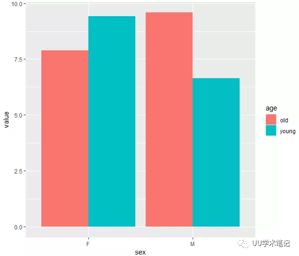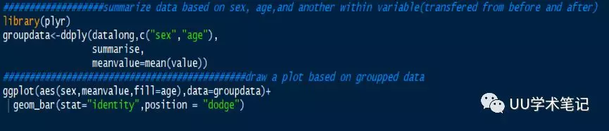ps: 可以看出两个图得出了一样的结果,另,数据汇总使用了plyr包中的ddply命令,按‘sex’和‘age’为分组变量求因变量的平均数)