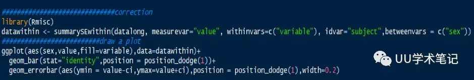 ps: 使用Rmisc包中的summarySEwithin命令进行校正,measurevar 指因变量,withinvar指被试内变量,idvar指确认被试身份的变量(被试编号),betweenvars 为被试间变量)