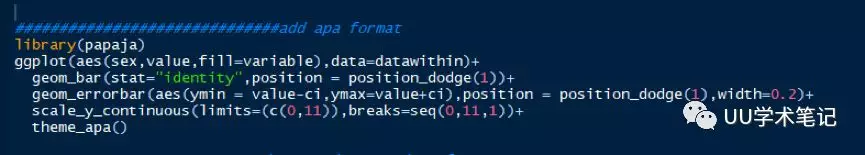 如果你想一键完成APA格式图片的修改以适应学术文章的发表要求,可以尝试使用papaja这个包,然后再ggplot2的画图命令中加入theme_apa()即可完成一键apa格式的效果。当然,如果是人工添加的图片标题而不是用画图命令生成的标题,则需要再修改图片标题。具体的例子如下: