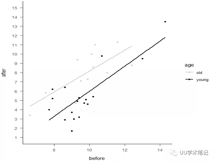 若需要作回归分析的交互作用图(注:这时的x轴是个连续变量,同时将before作为自变量,after作为因变量,仅供演示之用),可参考如下代码: