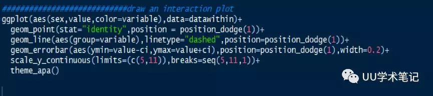 在澄清了画error-bar的一些注意事项之后,我们可以来进行交互作用图的制作。就方差分析的交互作用图而言,只需要在error-bar 图基础上加一个line图的图层即可,具体代码见下图: