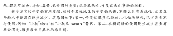 版)》(2012)将新乡方言划归为晋语邯新片获济小片。新乡话有“子变韵”或者“Z 变韵”,同河南郑州、焦作、开封、济源,山西阳城、晋城、陵川(侯精一 1985;侯精一、温端政 1993;乔全生1995)等方言一样。发音人张俊岭,男,1938 年生,初小文化,退休工人。同时又参照了另外两名中老年男性发音人的发音。