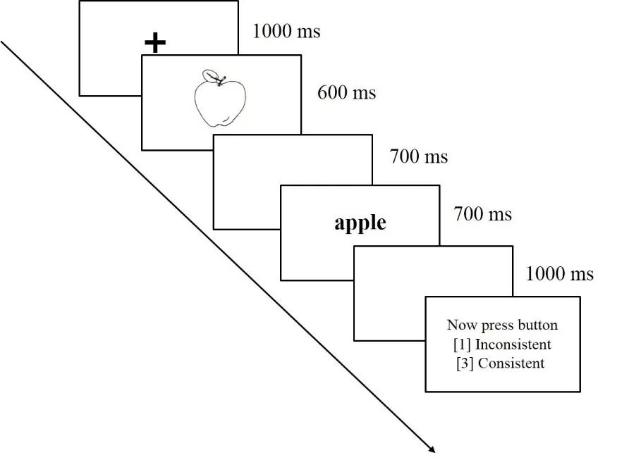 实验招募了20名二语高熟者和20名二语低熟者,采用了“图-词”匹配范式,同时考察了二语和母语两种语言条件,以母语作为控制条件。本研究为2(熟练度:高熟者vs.低熟者)╳ 2(图-词匹配度:匹配vs.不匹配)╳ 2(语言:二语vs.母语)三因素混合实验设计。图-词匹配度和语言为被试内因素,熟练度为被试间因素。实验流程(图1)为,首先呈现1000毫秒的注视点,然后呈现图片(600毫秒),接着呈现700毫秒的空屏,然后呈现单词(700毫秒),接着呈现1000毫秒的空屏,最后呈现提示语,要求被试判断图-词是否匹配。采用64导电极帽采集被试的脑电数据,数据处理根据单词的始出现时间进行脑电分段,主要考察300-600毫秒时间窗口下N400成分的潜伏期和波幅,并对这一时间窗口进行溯源分析,揭示脑电成分发生的神经源。