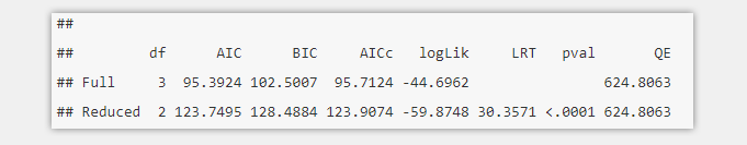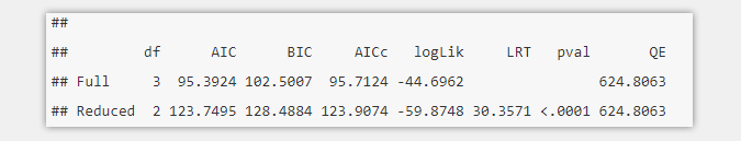 上图展示的结果中Model Results部分可以看到没有变化,但是水平2是否真的概括了数据中的变异了吗?我们可以借助anova()函数来比较全模型(full.model)和去掉水平2的模型(model.l2.removed).方法和结果如下:
