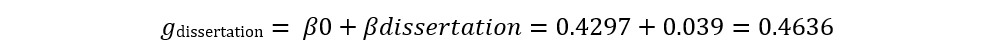 其中,最重要的输出结果是Test of Moderators。我们可以看到统计检验值F1,78 =0.0226, p=0.8808,说明小组之间没有显著差异。另一个输出参数为Model Results,它呈现出的是一个元回归框架表(within a meta-regression framework),该表格中的参数并非直接等于效应量,而是需要公式计算(如下图)。其中,第一行intrcpt参数(截距intercept),它代表的是当dissertation=0时g的取值,即同行评议文章的值。而第二行预测变量dissertation的估值可以理解成斜率(slope)。而整体效应量应等于截距(intercept)加上斜率(slope),公式如下。即:
