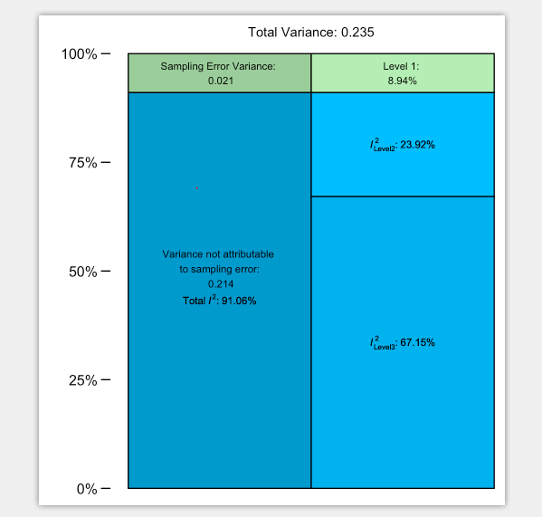 从图中可以看到level1上有8.94%变异,level2上有23.92%的变异,level3上占据67.15%的变异。其中level2和level3上的变异所占比等同于研究间异致性(between-study heterogeneity) I2 (见第六章内容)。但是,在三水平的元分析时,有三种类型的I2:I2Level2:描述了集群内异质性(within-cluster heterogeneity)的数量;I2Level3:描述了集群间异质性(between-cluster heterogeneity)的数量;I2total:描述了取样误差之外(sampling error)的总异质性(total amount of heterogeneity). I2total数值上等同于level2和level3上异质性之和。