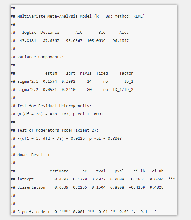 建立完三水平的元分析模型(three-level meta-analytic model)之后,我们可以对调节变量(moderator)的整体效应量(overall effect)进行检验,例如进行组间分析(subgroup analyses)。在R语言中,我们可以通过指定ram.mv()函数的输入参数mods来实现检验。在该函数中,mods参数在赋值之前应添加一个前置符号“~”,在样例中即mods = ~ dissertation。完整示例如下:model.mods<-rma.mv(y, v, random = ~ 1 | ID_1/ID_2, tdist = TRUE, data = mlm.data, method = "REML", mods = ~ dissertation)summary(model.mods)