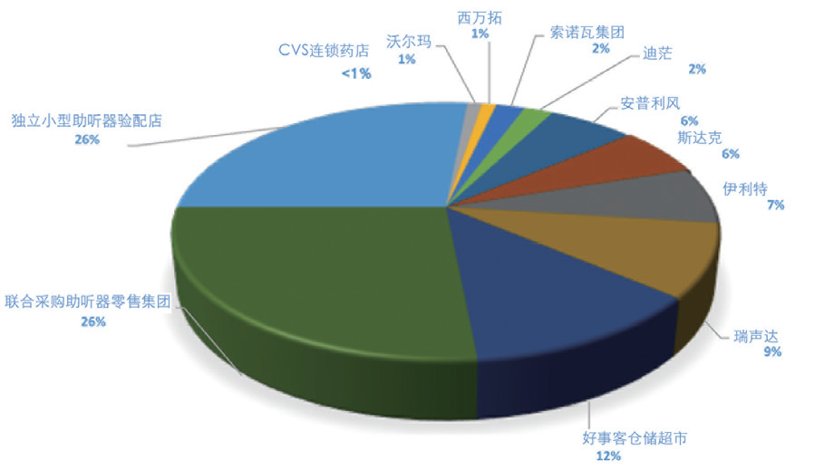行业的垂直渗透是听力服务市场的另一个重要特征。所谓垂直渗透(vertical penetration)指作为产业上游的生产厂商,绕开产业链中间的流通环节,直接将产品卖给消费者。过去20年间,全球最大听力产品厂商纷纷采取垂直渗透策略,通过收购听力服务终端连锁机构,或者自建零售系统等手段,直接面对听力损失患者,这种趋势随着市场整合步伐加快,越来越明显,市场份额也逐渐扩大。图3显示,仅在美国市场,全球五大助听器厂家控制了美国20%的听力服务终端市场。在欧洲和其他国家地区,助听器厂家拥有的直接销售终端比例可能还要高。