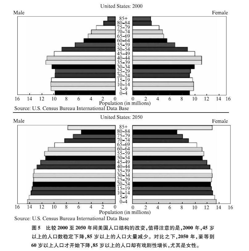 与此话题有关的是,另一个领域最近才兴起,迫切需要相关的研究,即目前世界以爆炸性的速率迈向高龄化,这主要是因为这一个半世纪以来,医学科技快速进展,公共健康及卫生条件也获得改善。19世纪的人通常活不过60岁,但依据目前的估计:“在发达国家,儿童有三分之一的机会会活到100岁。”(Greenfield 2015)图5显示了美国从2000年到2050年这半个世纪内的人口结构变迁,但这个趋势一个世纪前已经开始了,现在显然全球都面临同样的困境。