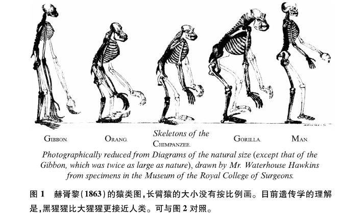 赫胥黎这本书的扉页上,有一张五种猿类的骨骼素描图,由左到右分别是长臂猿、红毛猩猩、黑猩猩、大猩猩和人类(见图1)。除了长臂猿以外,其他四个物种都按相对的真实比例绘制。以我们当前的知识来看,必须把顺序调整一下,黑猩猩应该比大猩猩更接近人类。