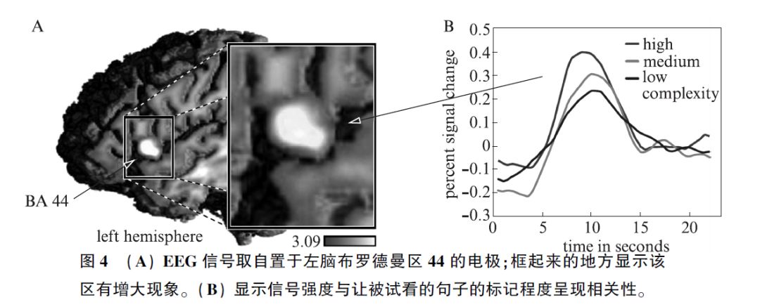 在例(2)中,与格宾语boy(男孩)被前置了,句法变得较有标记。在例(3)中,宾格lollipop(棒棒糖)也前置了,句法变得更有标记。如图4所示,在布罗德曼区44,也就是一般认为的布洛卡区所收集到的EEG,显示出句子的标记性(markedness)和EEG 反应的峰值振幅之间呈现系统性的相关。