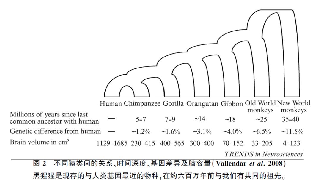 另一个归类猿类的方法是看它们的基因,这是最近才发展出的新方法。图2就是基于这样的归类,给出了与人类分离后时间深度的比较数据、与人类遗传差异的百分比和以立方毫米计算的脑容量大小。该图显示现存的与人类最近的亲属是黑猩猩,约六百万年前我们和它们有共同的祖先;相对地,我们和新世界猴子约在三千五百万年到四千万年前分化。人们常感困惑的是,我们和黑猩猩的DNA差距竟然只有1.2%;这个百分比的确很低,但是这里更重要的参数并非差异的量值,而是这个差异对物种演化的整体作用。