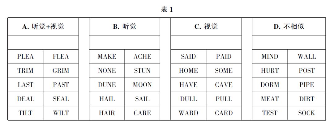 另一个EEG实验旨在区分语音判断和视觉判断,被试会看到表1所示四类不同的词对。(Polichet al.1983)请注意:A类的词不仅听觉上押韵,看起来也相似;B类的词押韵,但看起来不相似;C类的词不押韵,但看起来却相似;D类的词既不押韵也不相似。这四类词在反应时间和EEG脑电波模式上都会导致差异。