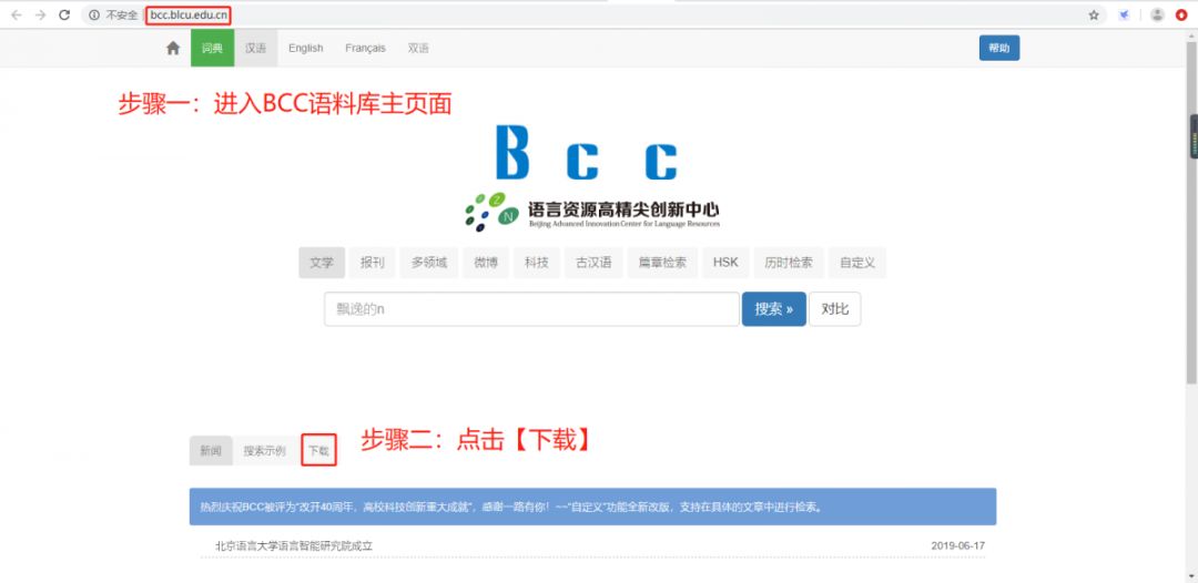 第一步,进入BCC语料库主页面:bcc.bicu.edu.cn
