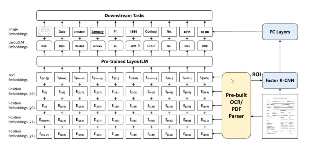LayoutLM 是 Document 的训练模型, 该模型考虑了分布信息。用 OCR 扫描文档,扫描结果加每一个识别对象的位置信息作为输入,得到 OCR 的结果,每个结果的位置信息,和对应文档的预训练模型,使用时,将预训练模型加图像的部分融入,做各项文档识别和信息抽取的任务。