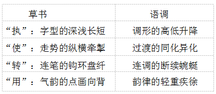从上述草书书法与口语话法各例的比较,可证草书的运笔和口语的发音都是动机起于内心,而发挥形诸笔、舌。草书中短语的连笔和口语中短语的连调,都合乎语法或“话法”;笔法的夸张离格和语音的强调离谱也都出自激情。而且连笔与连调的规则又都属于逆向的同化作用。在书法是:笔未到而走势先成,书画家称之为“意在笔先”;在话法是:声未出而口形先备,我们也可称之为“意在声先”。⑲书法、话法的同源,在一切艺术中也大都有同源之处。现在把草书的连写运笔规则和语调的连读变调规则作一总结对照: