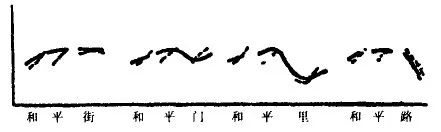 第四句是要求发音人加快来说,速度比前三句几乎快了一倍。于是中间各字都成了过渡,各字无法说得完整。除第一短语虽有缩短,但多少还维持原来的调形,其余各字调形全被拉平,急转直下而成了全降的语调。这在草书中是如同长句连写,如图一中四字以上的连笔以及图四中的各五字句连笔的例子。