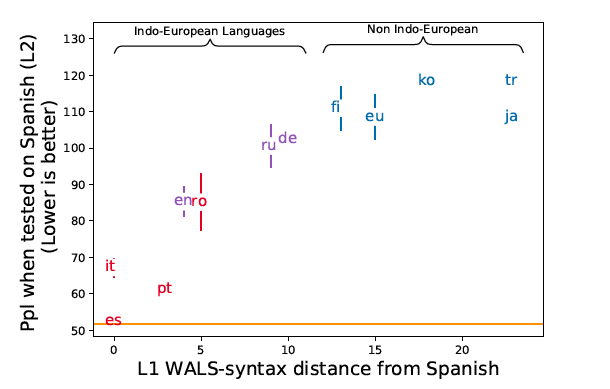 - 当L1是自然语言时,语言模型可以编码并迁移其中的句法结构嘛?可以,而且其与L2的句法距离越接近,句法结构的迁移性越好。