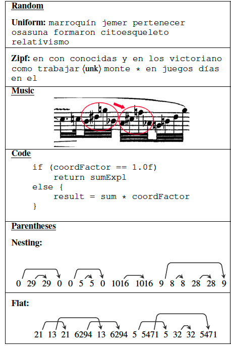 为了探究到底是music和Java code中的什么潜在结构提升了L2的性能呢?作者猜测会不会是其中的层级递归结构呢?但是在music和code上又不好直接验证。于是有了第三组实验来探究层级递归结构对L2的影响。作者伪造了两个括号数据(配对的整数数据),一个具有层级递归结构(Nesting parents),一个没有递归结构但是有配对的标记对的信息(Flat Parens)。可以看到他们俩给L2带来的性能提升几乎持平。那这是不是说明层级递归对L2没有多大用呢?是的,至少这篇文中的实验室设置下是的。但是作者说这也说明标记对的匹配预训练LSTM语言模型是有帮助的。他们甚至表现比用music的还好,你说神奇不神奇。