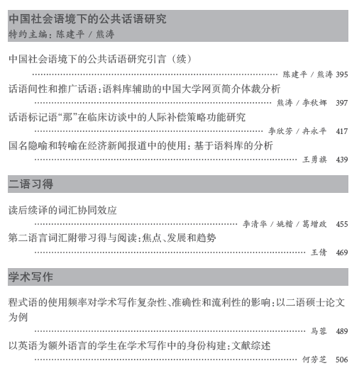 提要:本研究探索程式语使用的个体差异及其对学术写作流利性、准确性和复杂性的影响。基于对30篇二语硕士论文结论部分的分析,结果显示:1)学生作者倾向在单篇文本中多次重复使用特定的程式语;2)程式语对流利性产生显著影响,高频组写作者的流利性略高于低频组写作者;3)程式语对准确性产生一定的影响,高频组写作者在程式语和准确性之间表现出最强的相关性;4)程式语对词汇复杂性有显著的频率效应,低频组写作者的词汇复杂性略高于高频组写作者,且低频组写作者的程式语使用对句法复杂性也有显著影响;5)研究结果支持Skehan的竞争效应假设,流利性、准确性和复杂性之间的竞争在一定程度上受到程式语频率个体差异的影响,低频组写作者的流利性、准确性和复杂性间的竞争效应大于高频组写作者。