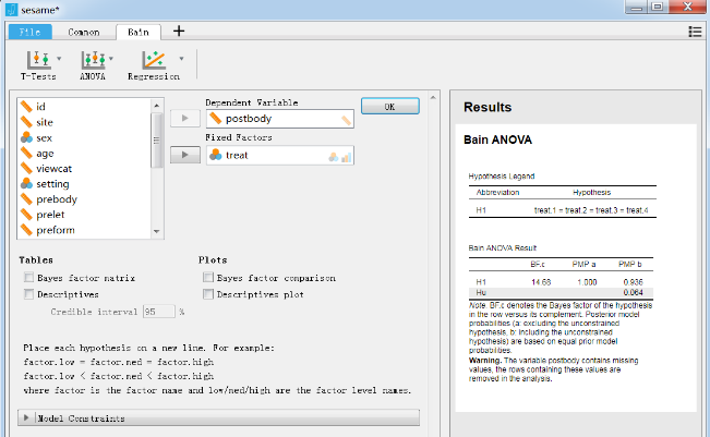 在实际使用中,已有很多软件能够实现贝叶斯因子的计算,包括R 包BayesFactor,bain, BFpack, bayestestR等,其中BayesFactor和bain包可在JASP可视化统计分析软件中通过点击的方式完成数据分析。