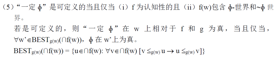 也就是说,"一定ɸ"为真需要ɸ在所有的最佳世界中都为真。另外,条件(i)保证了情态词“一定”只能表达认知情态,条件(ii)保证了认知情态词对间接证据的要求(requirement of indirectness,参见Lassiter 2016)。