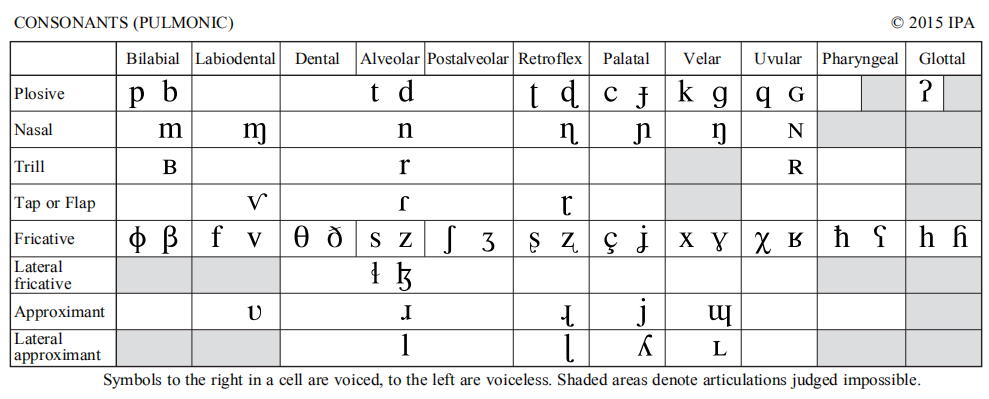 表中的这一部分都是辅音,但是专指采用肺部气流机制的辅音。其中,横向表示发音器官,纵向表示发音方式。