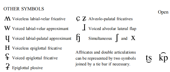 最后一部分是在元音和辅音表上没有列出来的一些较为特殊的字母。比如[w]其实有两个收窄点,一个是唇,一个是软腭。[ɕ]其实是汉语拼音中的x,是一个龈-硬腭擦音,但是在语言中使用较少;[ɧ]是瑞典语中的一个奇特发音,同时发[ʃ][x]这两个音;我们很熟悉的[ts]是其实是一个塞擦音。
