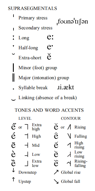 国际音标是语言学家为了转写和记录世界上所有的语音而创制的。包含了107个表示辅音和元音的字母、31个修饰辅音和元音的变音符号,以及19个用于表示超音段成分(包括音长、声调、重音、语调等)的特殊符号
