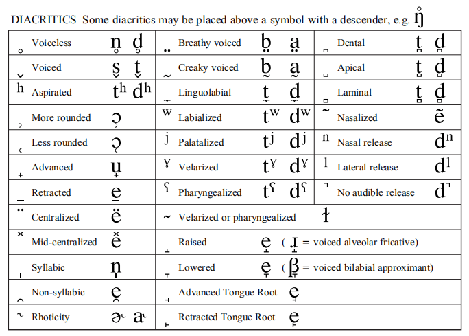 标音可以分为严式标音和宽式标音,最后一部分特殊符号就是用来更为精确地描述发音。比如,“开口度更大(小)”,“更加(非)圆唇”,“舌根向前(后)移”。还有一些表示语音变化的符号如“鼻化”,“卷舌化”,“唇化”,“无听感除阻”等。