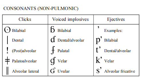 以上是采用非肺部气流机制的辅音。主要有三种: