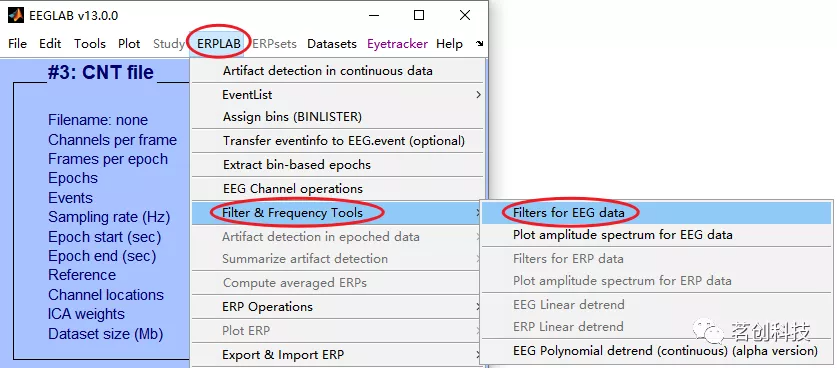 有两种方法进行滤波。在EEGLAB中进行滤波:点击Tools--Filter the data--Basic FIR filter (new,default)。在ERPLAB中进行滤波:点击ERPLAB--Filter&Frequency Tools--Filter for EEG data。