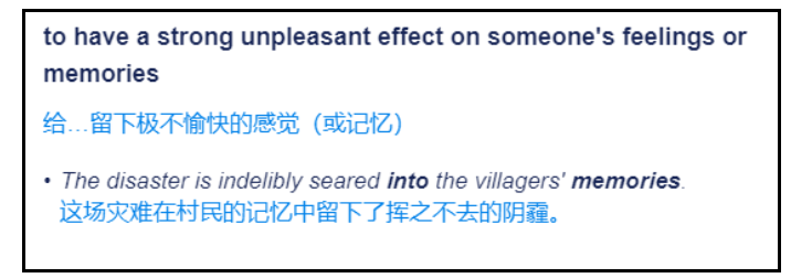 e.g. She was stung by her father's criticism.根据剑桥词典,distress意为“忧虑;悲伤;痛苦”,常常用来形容情感和心理上“被刺痛”。在表达某些人说过的话给你留下心理阴影时,可以用sear这个单词来形容这种感觉。这个单词本意是“(表皮)烧焦”的意思,这里也可以运用隐喻(metaphor)的方式,用来形容内心被灼伤。与sear相似,既可以用来形容肉体,也可以用来形容心灵的词还有torment。此外,torment还可以作名词,译为“肉体或精神上的折磨”。值得注意的是,表达“肉体折磨”时是不可数名词,用于精神层面时则多会以复数形式出现。比如: