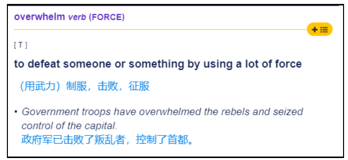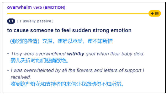 e.g. The ceremony really hit me and I began to cry.英语中另外一个动词overwhelm,也可以传递出情绪激动的感觉。根据剑桥词典,overwhelm作动词时表示“(感情上)使难以承受,使不知所措”。