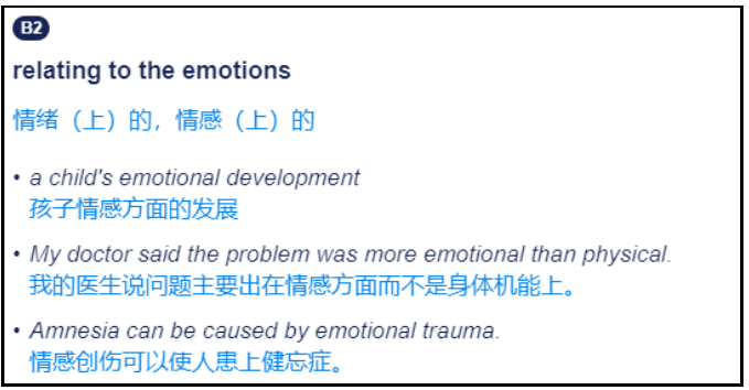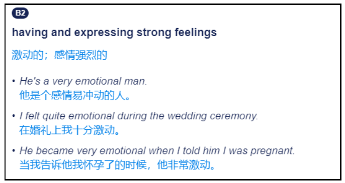 破防,原指游戏中“破除对方防御”的意思,是某方的防御被击碎,陷入受伤或被打败的境地时说的话。而现在,“破防”被大家广泛地运用了起来,结合不同场景有了很多解释,今天主要介绍两种:一种是说看到震撼或动人的场景,人们感到激动、感动的状态;另一种则是说一些人被嘲讽后的心急、恼火,或被戳到痛处后受伤的状态。那么想要表达以上两种状态的“破防”,用英文可以怎么说呢?有时候我们看到震撼或动人的场景时,会激动、感动,甚至热泪盈眶,比如:看到奥运赛场上为国争光的运动健儿,看到奔走在抗疫第一线的医护人员……这时就会听到有人说:“看到他们的付出,我真的破防了!”那么想要表达这层意思的“破防”,大家可以选用这些词:根据剑桥词典,emotional作形容词,可表示“情绪激动的;激起强烈情感的”。
