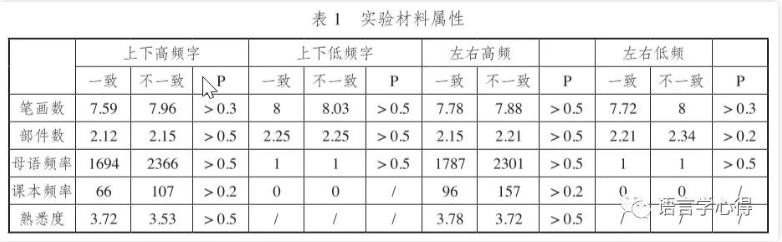 共 256 个实验材料,其中上下结构和左右结构各 128 个。每种结构包含高频一致 /不一致、低频一致 / 不一致四种条件。以上下结构高频材料“男”为例,先呈现学习刺激 “男”(上部件为目标刺激、下部件为背景),后呈现的测试刺激有四个:“男、思、务、冬”, 形成“男─男”(SC 组,目标部件相同 / 背景一致)、“男─思”(SIC 组,目标部件相同 / 背景不一致)、“男─务”(DC 组,目标部件不同 / 背景一致)、“男─冬”(DIC 组,目 标部件不同 / 背景不一致)四对测试材料。统计检验时,用 SC 与 SIC 组(肯定反应)之 间的差异作为一致性效应指标。DC 和 DIC 是与 SC、SIC 对应的两组否定反应,以实现 全部实验材料的反应平衡。实验材料的笔画数、部件数和频率属性进行严格匹配。实验材料属性见表 1。