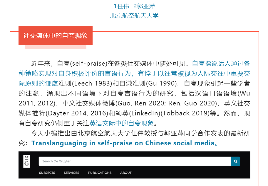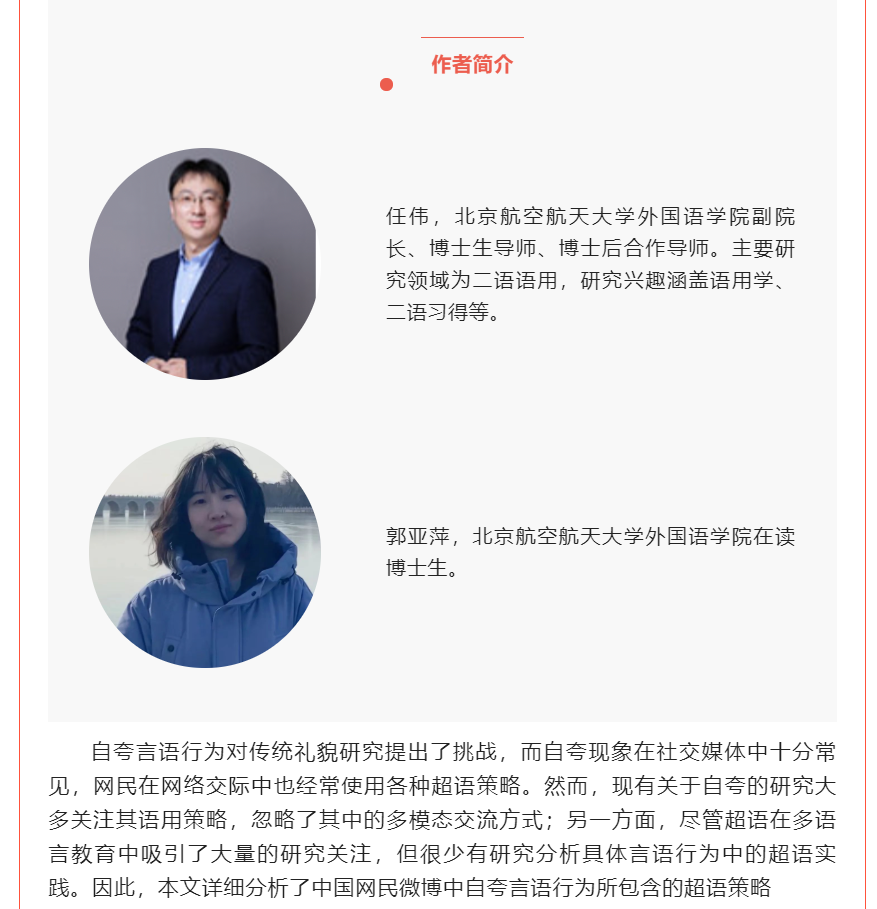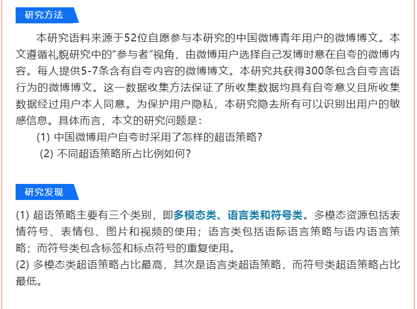 本研究考察了中国网民在微博上自夸中所使用的超语策略。研究结果表明,中国网民在微博上使用了三大超语策略,即多模态类、符号类和语言类。具体而言,多模态类超语策略包括图片、表情符号、表情包和视频的使用;语言类超语策略则包括语际语言策略与语内语言策略;符号类超语策略包括标签和标点符号的重复使用。本研究通过研究中国社会在微博上的自夸中的超语策略,对现有的与超语有关的文献做出了贡献。