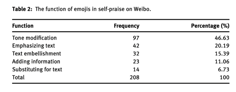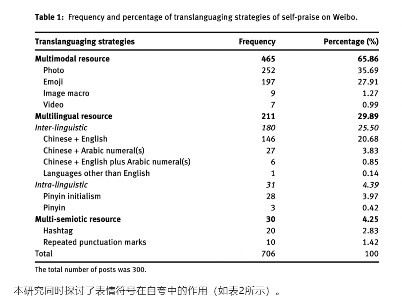 (3) 超语是一个动态持续的过程,在这个过程中,个人经验、信仰、偏好、意识形态、认知能力和物质资本等多个维度资源被整合成一个整体(Li,2011)。在这项研究中,中国微博用户在自夸中采用超语策略,也是塑造他们特定身份的一种方式。此外,超语不仅是个人的,也是文化的(Schreiber,2015),它可以表现为某一群人之间在线互动的共同模式。例如,尽管网民在自夸方面保持着不对称的偏好(Androutsopoulos,2015),但中国用户在社交媒体上的行为有着相似的模式,包括使用一些中国文化特有的语言资源、表情符号和照片。频繁使用各种超语策略来减轻自夸强度,更符合中国文化中高度重视的谦虚特质(Gu, 1990; Ren & Guo, 2020)。
