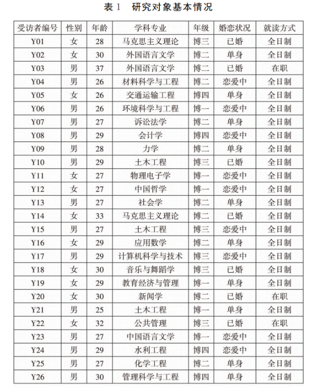 本研究主要采用质性研究中常用的目的性抽 样以及斯特劳斯和科宾(JulietCorbin)提出的理 论性抽样来选择研究对象,以获取研究所需的资料。理论性抽样过程是逐步累积的,通过概念驱 动研究资料的收集和分析,在不断归纳、加工资料 的基础上完善概念和范畴,建立理论假设。研究 者首先选择在北京某“双一流”建设高校就读的3 位博士生进行深度访谈,经过对访谈资料的详尽 分析和概念化,形成相应的范畴及其维度,并据此 对其他博士生展开访谈,探究新的范畴及范畴关 系。为了保证原始数据的有效性和代表性,在调 查过程中,本研究尽可能从追求学术卓越的“双一 流”建设高 校 中 选 择 访 谈 对 象,同时兼顾攻读专 业、年级、性别、婚恋状况等样本特征。最终,基于 理论饱和度原则,即访谈对象所提供的信息中不 再有新的主题或概念出现[18],本研究确定了来自 全国13所“双一流”建设高校的26位在读博士生 作为受访对象,其基本情况如表1所示。