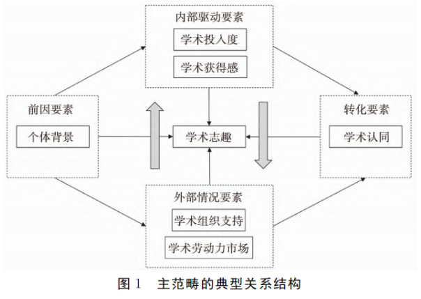 学术志趣是坚定个体学术道路、提高博士生培养质量的重要基础。文章基于扎根理论方法对博士生学 术志趣成长的核心要素及作用机理进行探究,并构建了学术志趣成长机制模型。模型显示:先赋背景和早期学术经历影响学术志趣的最初萌芽;个体学术投入度与获得感是志趣成长的内驱动力;学术组织支持和学术劳动力市场是作用于学术志趣的外部动力;学术认同是促使博士生确立学术志趣、从事学术职业的决定力量。通过加强本科阶段学术训练,严格博士生培养过程管理,完善学术组织支持,优化学术劳动力市场生态,有助于深化学术内在认同,引导博士生以学术为志业。