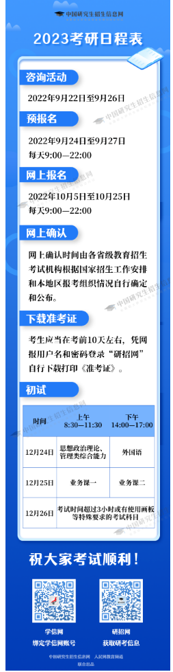2023年全国硕士研究生招生考试初试定于2022年12月24日至25日,考试时间超过3小时或有使用画板等特殊要求的少数考试科目安排在12月26日。
