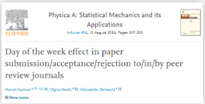 2016年8月15日,著名的统计学应用期刊“Physica A: Statistical Mechanics and its Applications ”在线出版了这篇文章,文章全名为“Day of the week effect in paper submission/acceptance/rejection to/in/by peer review journals”,中文译名为《在同行评议期刊中的文章接受投递/接受/拒稿的星期几效应》。