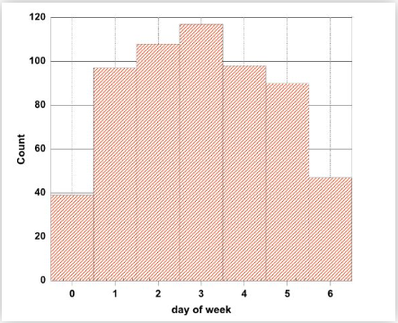研究人员收集了在2013年和2014年期间通过电子方式投稿至《塞尔维亚化学学会杂志》(JSCS,在2012年的影响因子为0.912)的文章情况,收集到的文章总数为596篇。下图是JSCS期刊在2013年至2014年期间收到的所有按星期分类的SCI稿件数量。