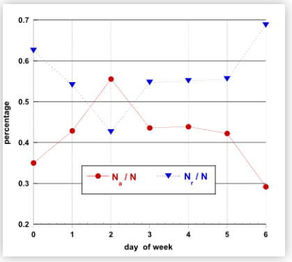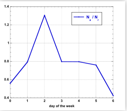 此外,在得出上图之后,研究人员又使用“Na/Nr”作为“接受/拒稿率”对“周二效应”形成了直观描述,如下图所示。